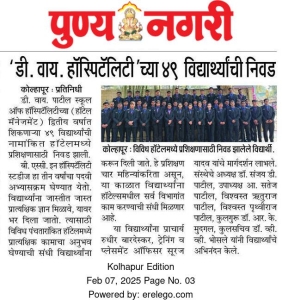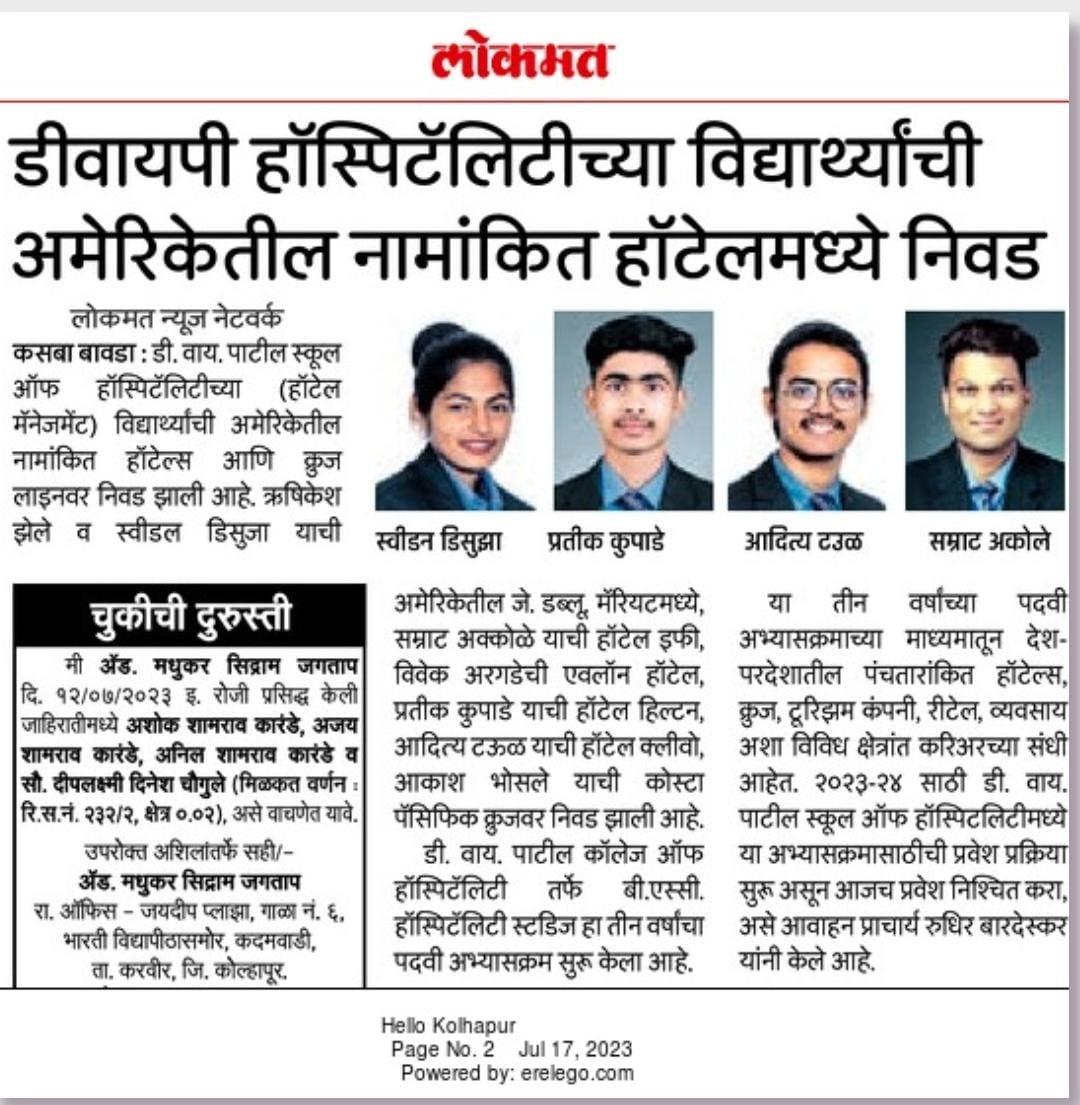 Established in 2019, the D. Y. Patil School of Hospitality is a symbol of excellence in Hospitality, Hotel and Tourism education and training. It is a constituent unit of D.Y.Patil Education Society (Deemed to be University), which is accredited by NAAC with A++ grade in the 3rd cycle. Our commitment to quality education is matched by our dedication to meeting global standards in hospitality education. Read More....